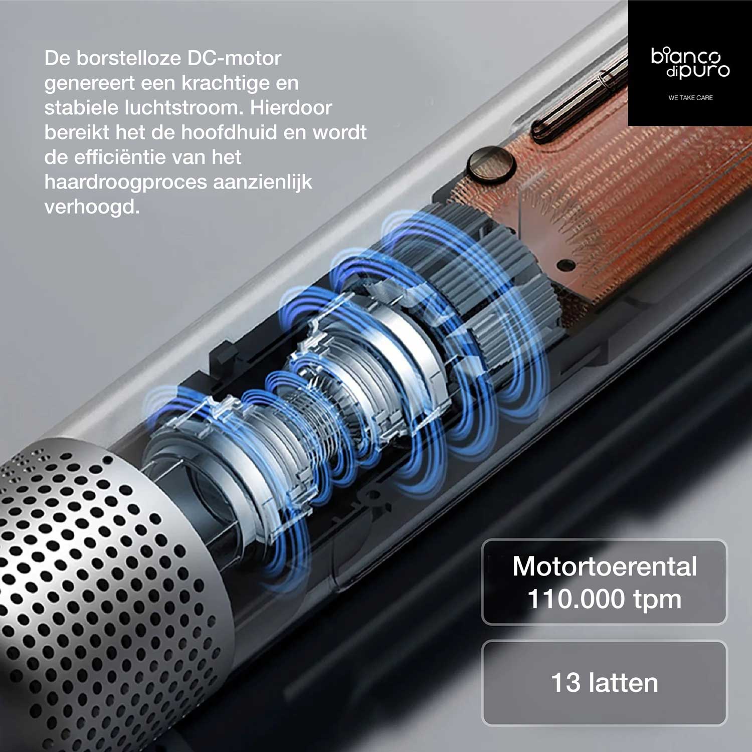 De 13-lamellen, turbineachtige aandrijving van de BELLA is maar liefst 5,7 keer efficiënter en genereert – dankzij 110.000 toeren per minuut – een aanzienlijk krachtigere luchtstroom*.