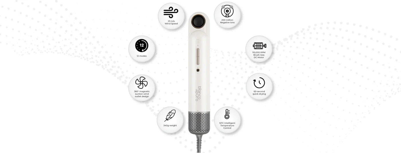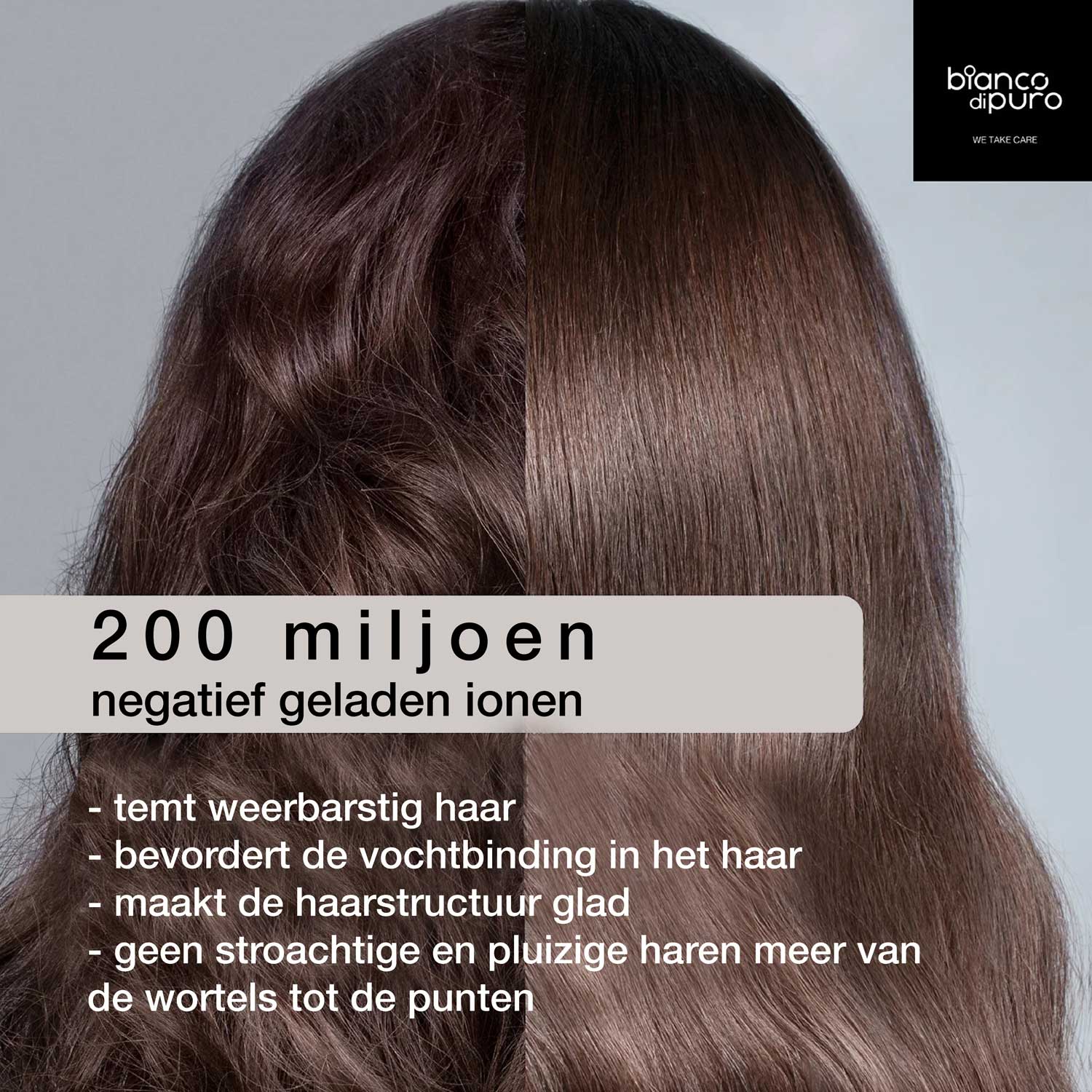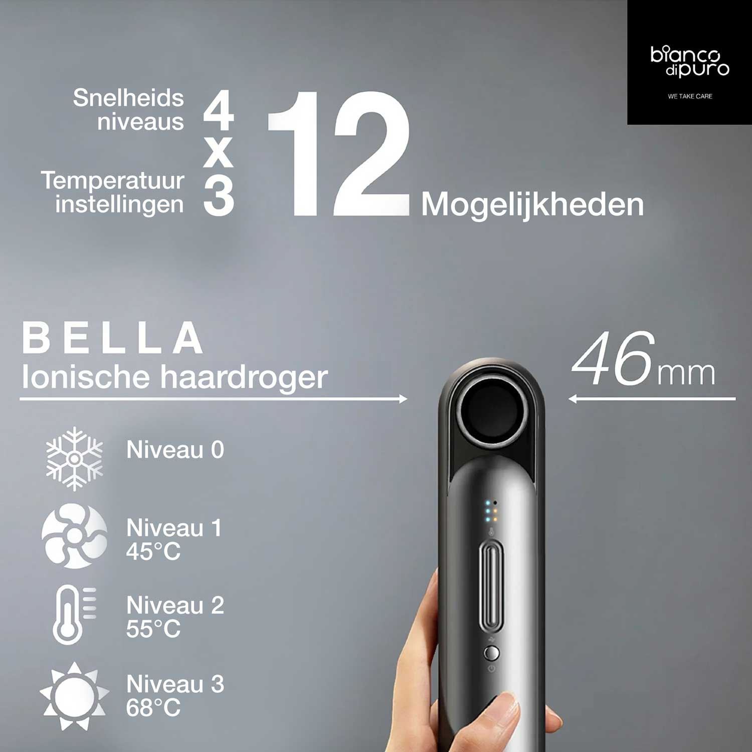 De Supersonic haardroger BELLA van bianco di puro geeft negatief geladen ionen af om positief geladen (vaak droog en beschadigd) haar te neutraliseren. Dit vermindert statische elektriciteit en pluizig haar, zonder het haar te verzwaren of te beschadigen.