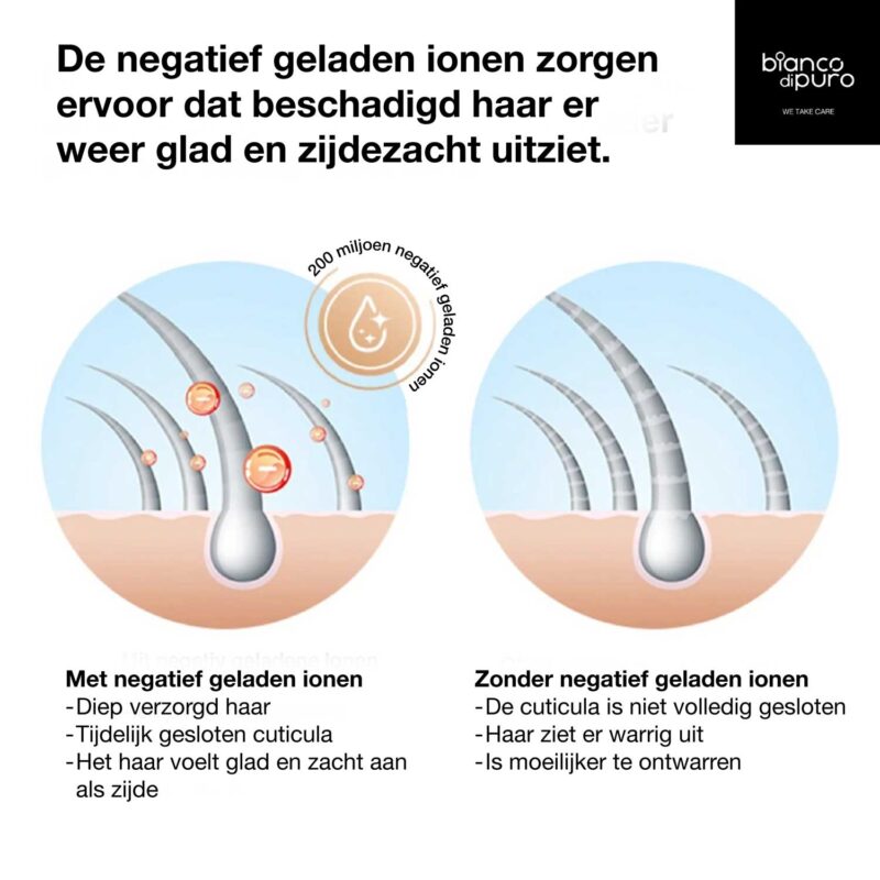 Tegelijkertijd ondersteunt deze luchtstroom het natuurlijke vochtvasthoudend vermogen van het haar, wat zorgt voor een glad haaroppervlak en minder pluizige of statisch geladen haren.